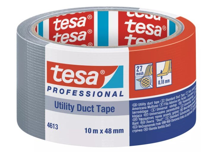 tesa® 4613 is a utility grade duct tape. It consists of a 27 mesh woven PET/cotton fabric backing coated with a natural rubber adhesive. tesa® duct 4613 is a self adhesive tape with typical duct features for a wide range of applications. Features: ▪ good adhesion even on rough surfaces ▪ easy to tear by hand ▪ water repellent ▪ flexible ▪ available in 2 colors: black, silver Main Application ▪ Sealing of ducts ▪ Fastening of protection films ▪ Sealing of rubbish bags ▪ Fixing, closing, packaging and a lot mor ▪ Hand tearability ▪ Straight tear edges ▪ Abrasion resistance ▪ Water resistance Evaluation across relevant tesa® assortment: very good good medium low